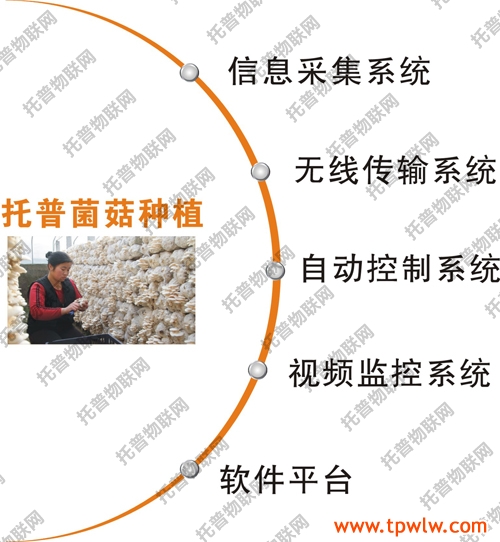 托普菌菇種植包括五大系統(tǒng):1.信息采集系統(tǒng)—可采集空氣溫濕度、土壤溫濕度、光照強度、二氧化碳強度等參數(shù);2.無線傳輸系統(tǒng)—可遠(yuǎn)程無線傳輸數(shù)據(jù);3.自動控制系統(tǒng)—包括噴灌、卷簾、風(fēng)機、加熱、補光等,達到作物適合生長環(huán)境;4.視頻監(jiān)控系統(tǒng)—查看作物實時生長情況、病蟲害防治和自動監(jiān)控功能;5.軟件平臺---遠(yuǎn)程數(shù)據(jù)實時查看參數(shù)和自動控制功能,各類報警功能等。