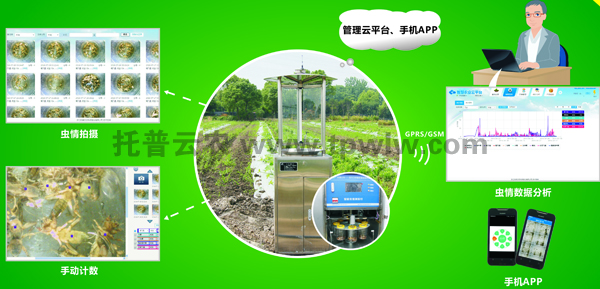 ?????? 托普云農蟲情測報燈6.0,能夠自動拍照將現場拍攝的圖片無線發送至監測平臺,通過手機、電腦即可查看,無需下田;手動分類計數,轉倉及報警,數據可生成報表形式,清晰直觀查看所有蟲情監測設備的監測數據。