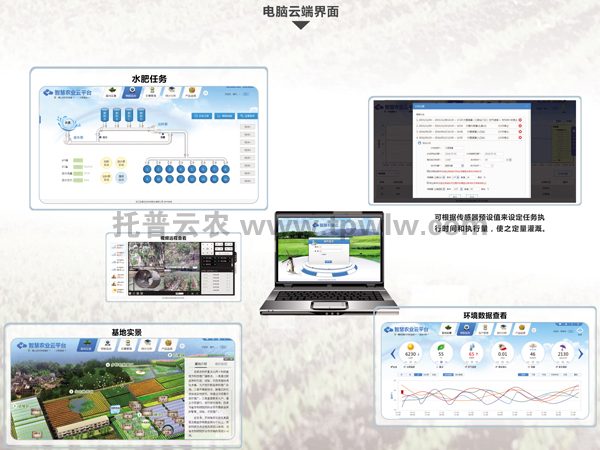 ?????? 基地安裝的托普云農(nóng)的溫室小管家、空氣溫濕度、光照強(qiáng)度、二氧化碳、土壤溫濕度、智能水肥裝置、視頻監(jiān)控系統(tǒng)等智能硬件可遠(yuǎn)程在線實(shí)時(shí)采集溫室環(huán)境信息,上傳至托普智慧農(nóng)業(yè)云平臺(tái),在管理平臺(tái)設(shè)置環(huán)境上下限值即可實(shí)現(xiàn)預(yù)警,定制的托普智慧農(nóng)業(yè)管理平臺(tái)通過手機(jī)或電腦可遠(yuǎn)程自動(dòng)開啟相關(guān)的通風(fēng)、濕簾、灌溉等設(shè)備,查看環(huán)境數(shù)據(jù)、視頻信息、遠(yuǎn)程進(jìn)行專家咨詢、查看作物生長(zhǎng)情況、設(shè)備運(yùn)行狀況、園區(qū)安防情況等。實(shí)現(xiàn)溫室大棚的信息化、智能化、簡(jiǎn)約化管理。真正做到手機(jī)、電腦在手,管理無(wú)憂。