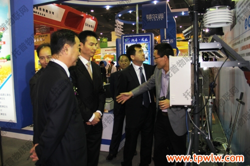 圖為:業界領導在托普展位了解固定式無線土壤墑情檢測系統