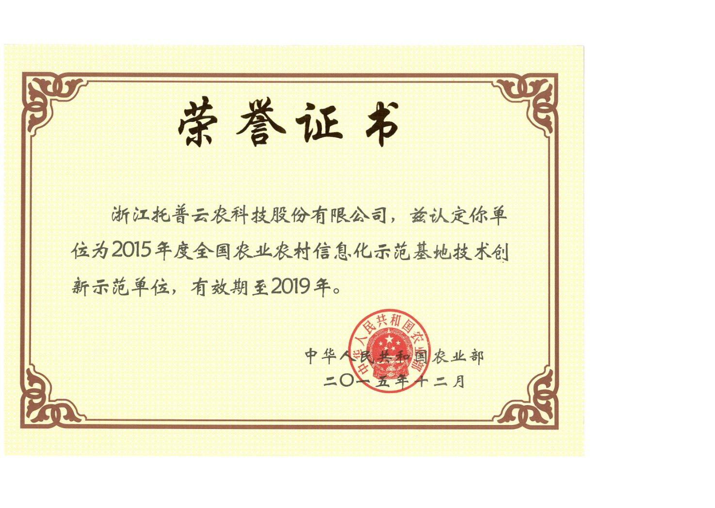 2015年12月9日,農業部發文公布《農業部關于認定2015年度全國農業農村信息化示范基地的通知》,浙江托普云農科技股份有限公司獲批技術創新型示范單位。《通知》要求各示范基地,秉持創新、協調、綠色、開放、共享的發展理念,積極推進“互聯網+”現代農業行動,大力發展農業,切實抓好農業電子商務、農業物聯網、農業農村大數據、農業信息服務等重點工作,大膽探索創新,充分發揮示范引領作用,為推進農業現代化作出新貢獻。