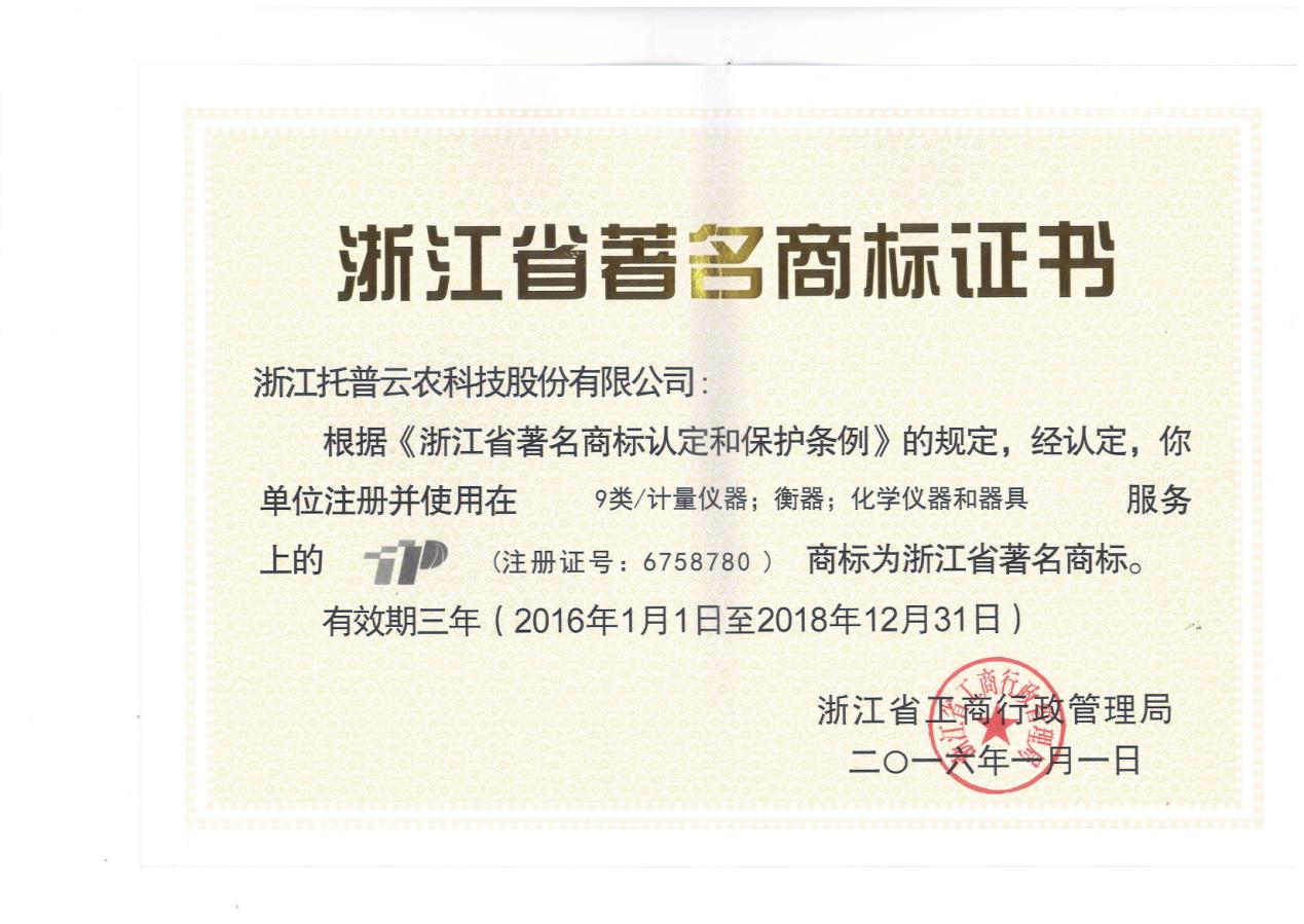根據《浙江省著名商標認定和保護條例》的規定,2016年1月1日,經浙江省工商行政管理局認定,我單位注冊并使用在“9類/計量儀器;衡器;化學儀器和器具”服務上的