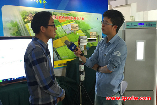 圖為工作人員接受記者采訪除了展示1500多個瓜菜新優品種,很多企業帶來的最新農業種植和管理技術特別吸引眼球,浙江托普云農科技股份有限公司(以下簡稱“托普云農”)的物聯網系統,引得前來采訪的記者駐足。