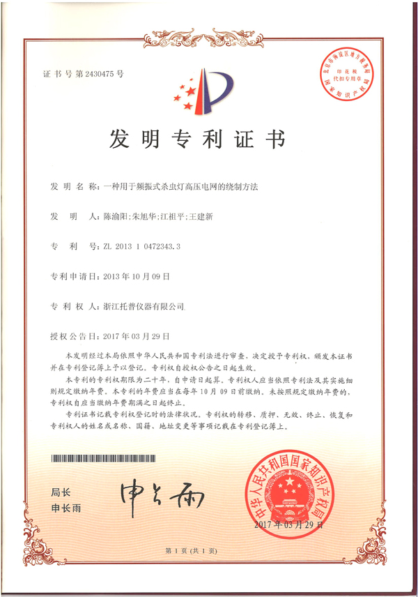 - 托普云農又喜獲發明專利發表日期:2017-04-14 來源:托普云農 瀏覽次數:4434次近日,我司托普云農又喜獲一項發明專利。據悉,該發明專利名稱為“一種用于頻振式殺蟲燈高壓電網的繞制方法”,發明專號為ZL201310472343.3。相較于傳統的殺蟲燈繞制方法,“一種用于頻振式殺蟲燈高壓電網的繞制方法”是一種用專門設計的螺旋繞線機實現殺蟲燈高壓電網繞線的方法。該發明專利于2013年10月9日向國家知識產權局申請,并于2017年3月29日正式得到授權。據業內專家評價,該專利由于電網間距由螺桿螺距保證,使得繞制后的電網間距均勻一致。此外,繞制方法操作方便,繞制效率高且繞線緊致不易松落造成短路,具有良好的普及運用價值。