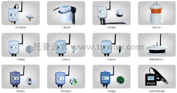 在農業氣象方面,目前有空氣溫度、濕度、光照強度、光合有效輻射、二氧化碳、雨量、蒸發、風速風向、大氣壓、總輻射、紫外輻射等傳感器。同時,還有應用于畜禽養殖監測的氨氣、硫化氫等傳感器,應用于水質監測的pH、余氯、濁度、溶解氧、氨氮、水溫等傳感器,應用于環境監測的一氧化碳、二氧化碳、甲醛、PM2.5、PM10等傳感器。
