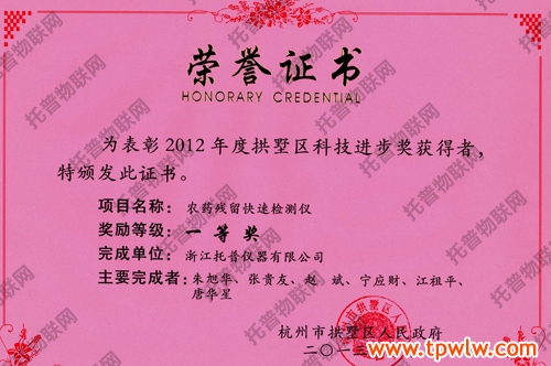 2012年度拱墅區科學技術進步獎通過企業申報,有關部門推薦,并經專家評審,托普儀器農藥殘留快速檢測儀項目最終獲得2012年度拱墅區科技進步獎一等獎。