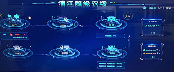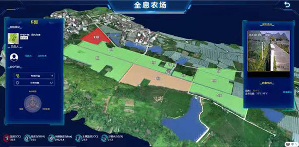 作為智慧農(nóng)業(yè)的升級(jí)版本,“超級(jí)農(nóng)場(chǎng)”項(xiàng)目對(duì)生產(chǎn)經(jīng)營(yíng)管理等每一個(gè)環(huán)節(jié),都進(jìn)行了嚴(yán)格的監(jiān)管,數(shù)據(jù)采集,實(shí)時(shí)監(jiān)測(cè)。通過(guò)無(wú)人機(jī)的航拍,實(shí)現(xiàn)了對(duì)整個(gè)農(nóng)場(chǎng)的3D建模,把整個(gè)農(nóng)場(chǎng)分成A—K,差不多11個(gè)區(qū)塊,然后進(jìn)行區(qū)塊的數(shù)字化監(jiān)控。一塊電子顯示屏就可看到農(nóng)場(chǎng)的所有狀況,葡萄園11個(gè)鋼架大棚所有環(huán)境信息,包括溫度、濕度、土壤酸堿值、光照等情況都呈現(xiàn)在屏幕上。另外,葡萄園里各處分布了多少攝像頭,有多少在職人員,多少外來(lái)人員,也都能一目了然。