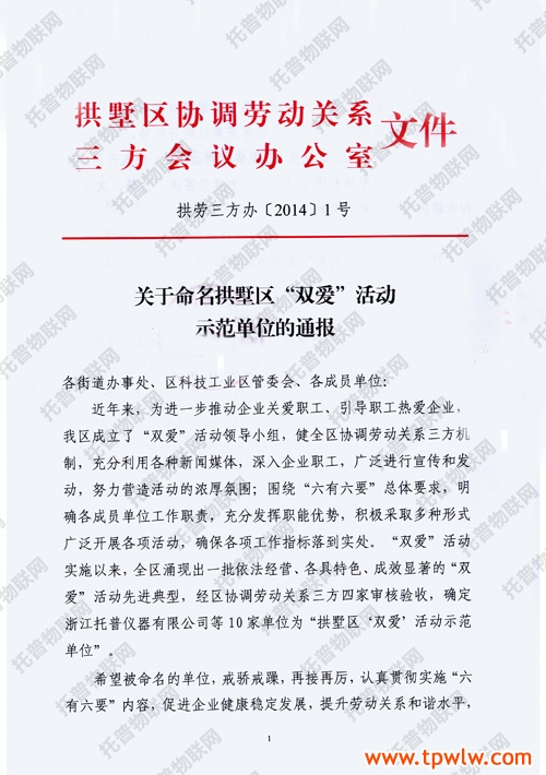 近日,《關(guān)于命名拱墅區(qū)“雙愛”活動(dòng)示范單位的通報(bào)》文件頒布,托普儀器被評(píng)選為拱墅區(qū)“雙愛”活動(dòng)示范單位。