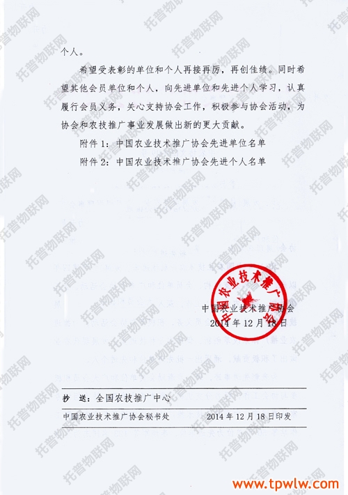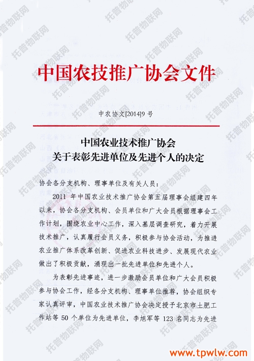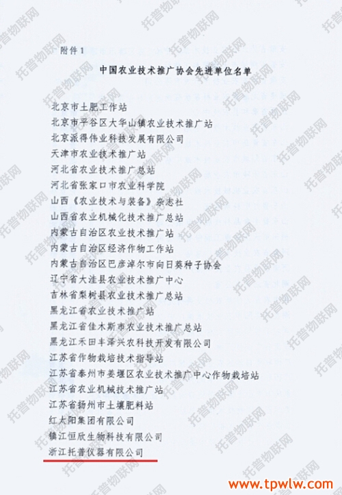 經(jīng)逐級(jí)推薦及專家評(píng)審,在“中國(guó)農(nóng)業(yè)技術(shù)推廣協(xié)會(huì)關(guān)于表彰先進(jìn)單位及個(gè)人的決定”中,托普儀器被評(píng)為“中國(guó)農(nóng)業(yè)技術(shù)推廣協(xié)會(huì)第五屆理事會(huì)先進(jìn)單位”,同時(shí),公司陳渝陽(yáng)總經(jīng)理也被評(píng)為“中國(guó)農(nóng)業(yè)技術(shù)推廣協(xié)會(huì)第五屆理事會(huì)先進(jìn)個(gè)人”。