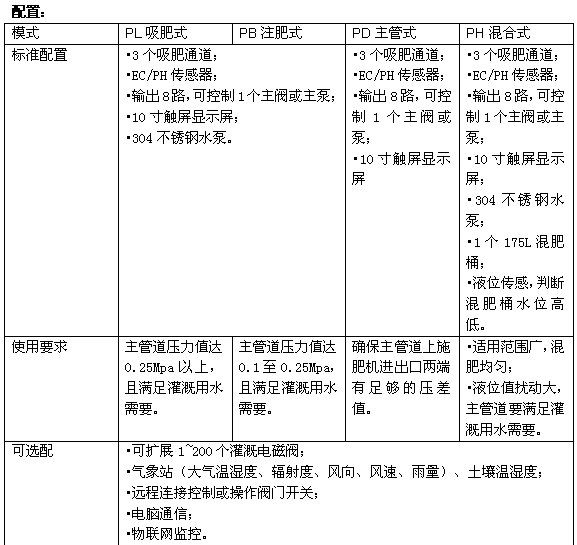 ? 采用文丘里注肥器,維修方便,最多可配8個;標配4個通道。單個文丘里吸肥通道吸肥量從50L/h—1000L/h。