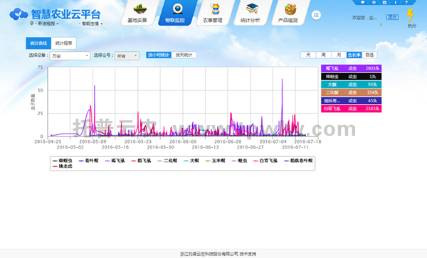 系統(tǒng)通過搭建在田間的智能蟲情監(jiān)測設(shè)備,可以無公害誘捕殺蟲,綠色環(huán)保,同時利用GPRS/3G移動無線網(wǎng)路,定時采集現(xiàn)場圖像,自動上傳到遠(yuǎn)端的物聯(lián)網(wǎng)監(jiān)控服務(wù)平臺,工作人員可隨時遠(yuǎn)程了解田間蟲情情況與變化,制定防治措施。通過系統(tǒng)設(shè)置或遠(yuǎn)程設(shè)置后自動拍照將現(xiàn)場拍攝的圖片無線發(fā)送至監(jiān)測平臺,平臺自動記錄每天采集數(shù)據(jù),形成蟲害數(shù)據(jù)庫,可以各種圖表、列表形式展現(xiàn)給農(nóng)業(yè)專家進(jìn)行遠(yuǎn)程診斷。