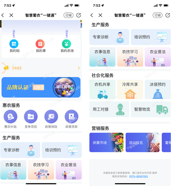 葡萄產業是浦江縣農業主導產業,產業種植面積達6.9萬畝,年產量12.5萬噸、產值11.4億元,從業人員達5萬多人,位居浦江農業之首。智慧“葡農一鍵通”應用以服務葡農“種好果、賣好價”為切入口,以大數據、云計算等技術為手段,匯集葡萄產業數據資源,打造科學生產、品牌管理、高效配套、惠農政策、優質優銷的全周期服務場景,幫助葡農“種好、管好、賣好葡萄”,加速產業模式標準化、規模化轉型,提升農戶獲得感,帶動共同富裕。